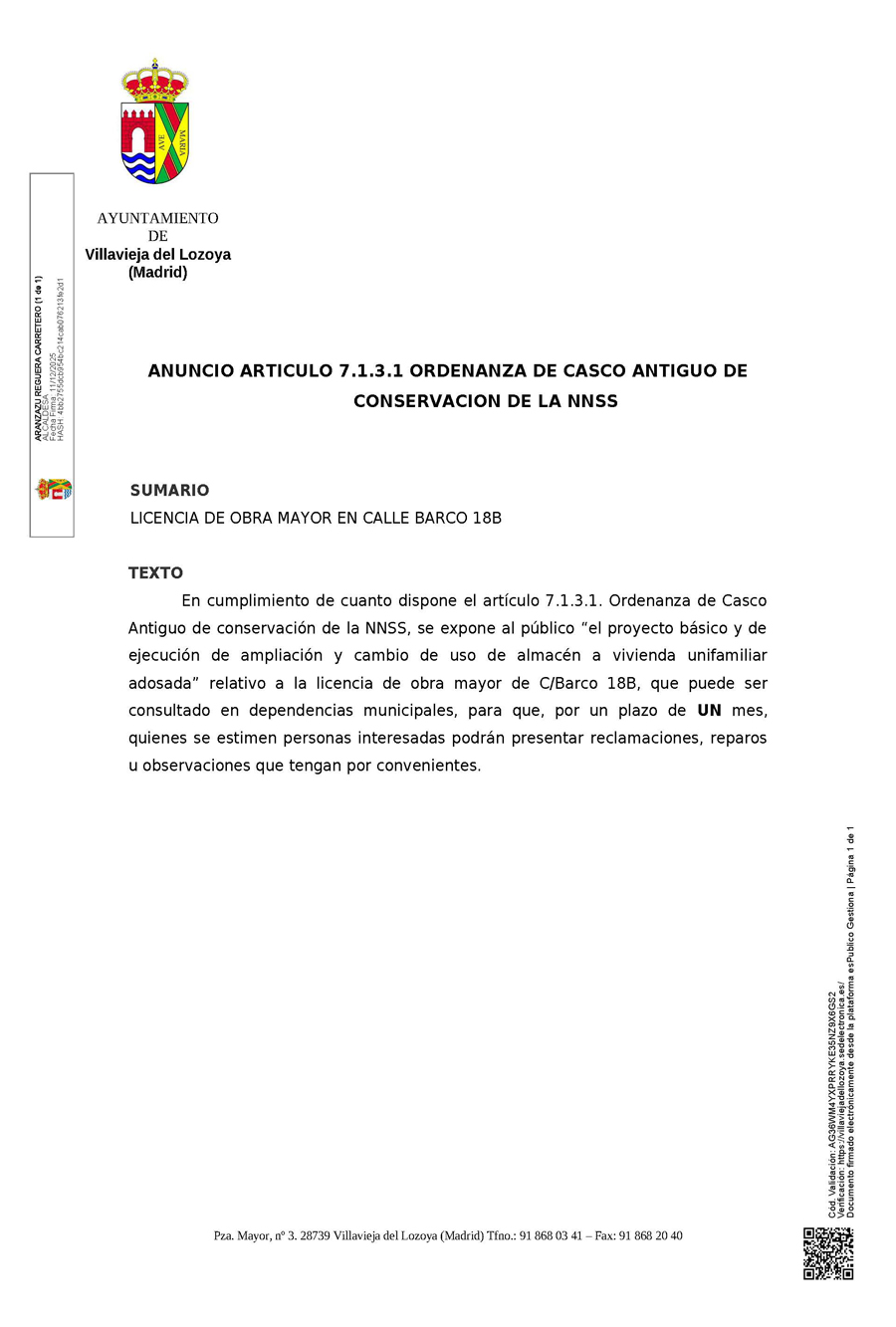 ANUNCIO ARTICULO 7.1.3.1 ORDENANZA DE CASCO ANTIGUO DE CONSERVACIÓN DE LA NNSS
