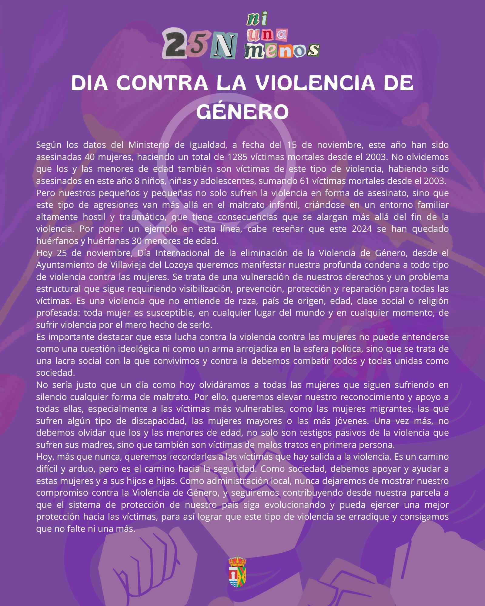Hoy 25 de noviembre, Día Internacional de la eliminación de la Violencia de Género, desde el Ayuntamiento de Villavieja del Lozoya queremos manifestar nuestra profunda condena a todo tipo de violencia contra las mujeres. Se trata de una vulneración de nuestros derechos y un problema estructural que sigue requiriendo visibilización, prevención, protección y reparación para todas las víctimas. Es una violencia que no entiende de raza, país de origen, edad, clase social o religión profesada: toda mujer es susceptible, en cualquier lugar del mundo y en cualquier momento, de sufrir violencia por el mero hecho de serlo.