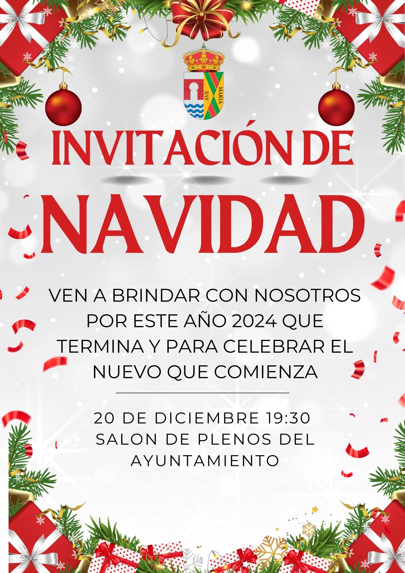 Invitación de Navidad del Ayuntamiento el próximo viernes 20 de diciembre a las 19:30 en el salón de plenos del Ayuntamientos. Os esperamos para brindar con nosotros por el año que termina y el nuevo 2025 que empieza!!!!