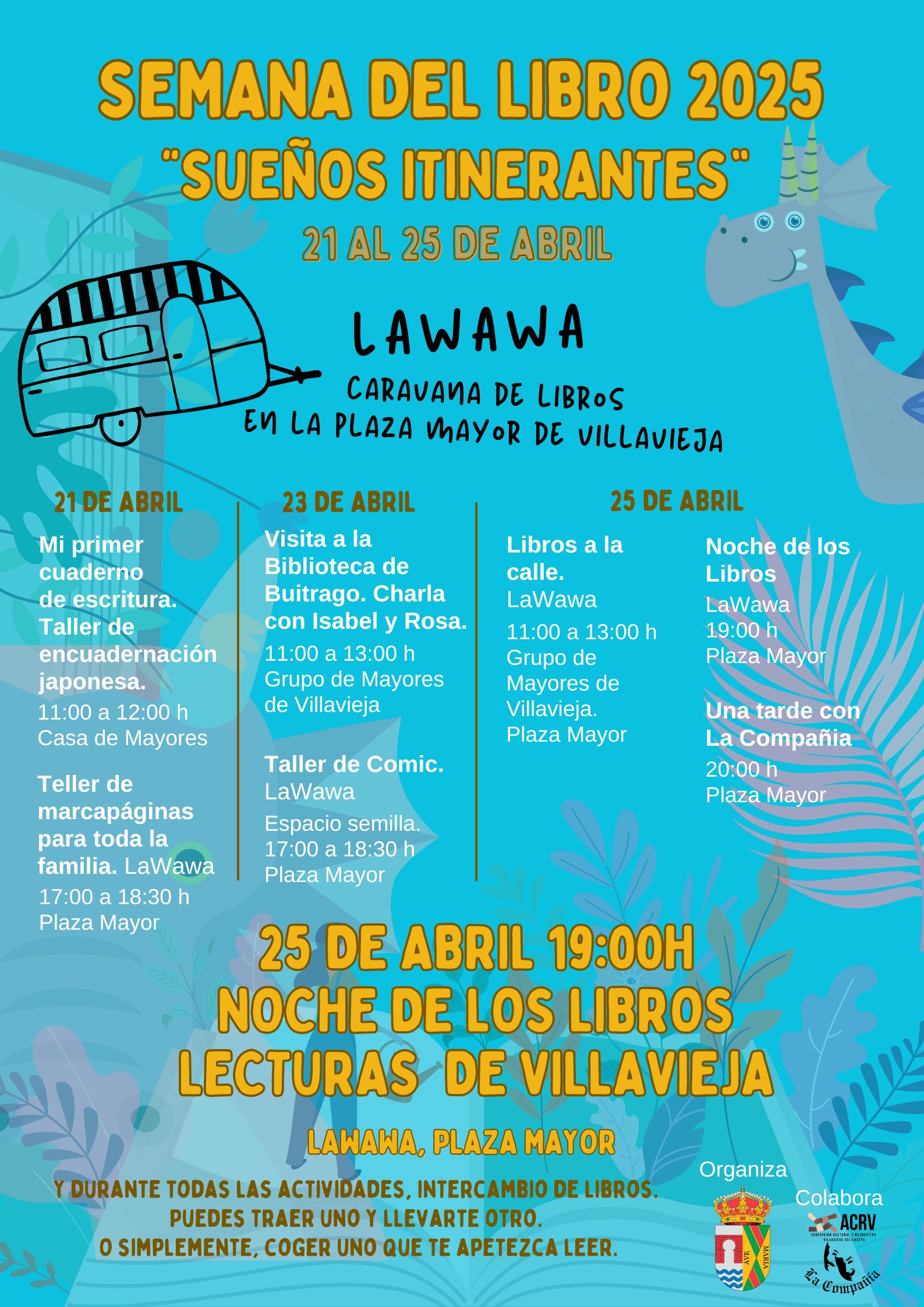Os compartimos la programación de la Semana del Libro de Villavieja. Hay talleres, lecturas, visitas a la Biblioteca de Buitrago… Y una caravana llena de sorpresas que se instalará en la Plaza Mayor toda la semana!!!