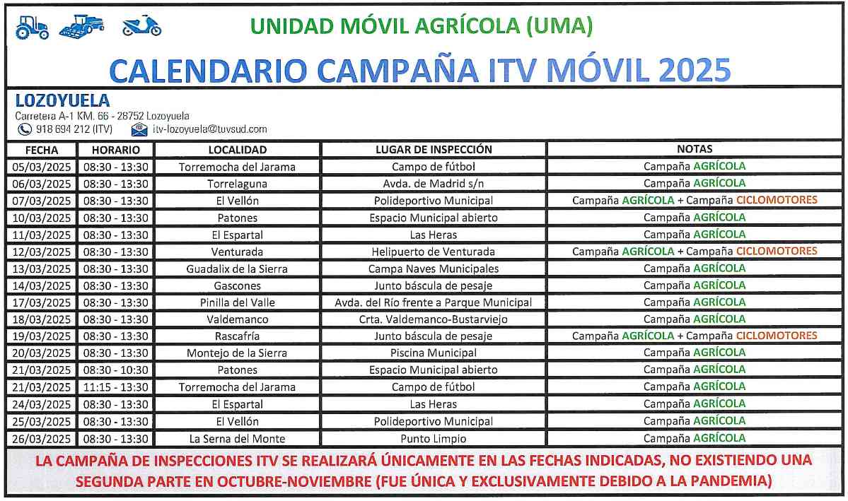 Unidad Móvil Agrícola (UMA). Calendario Campaña ITV Móvil 2025